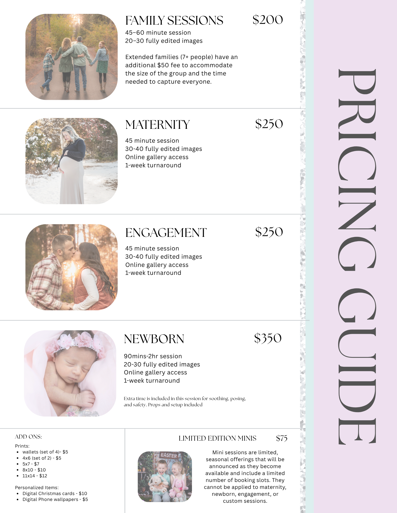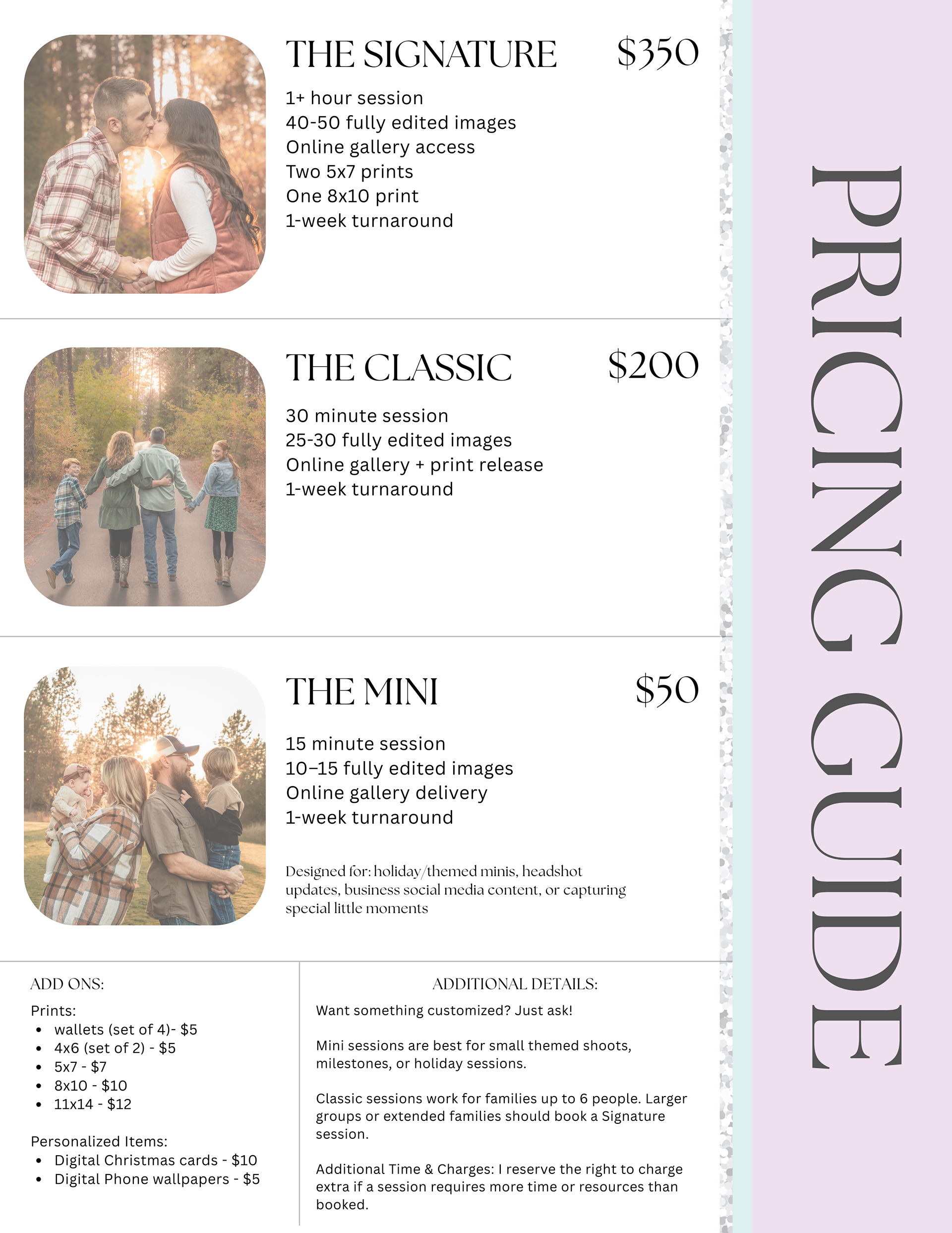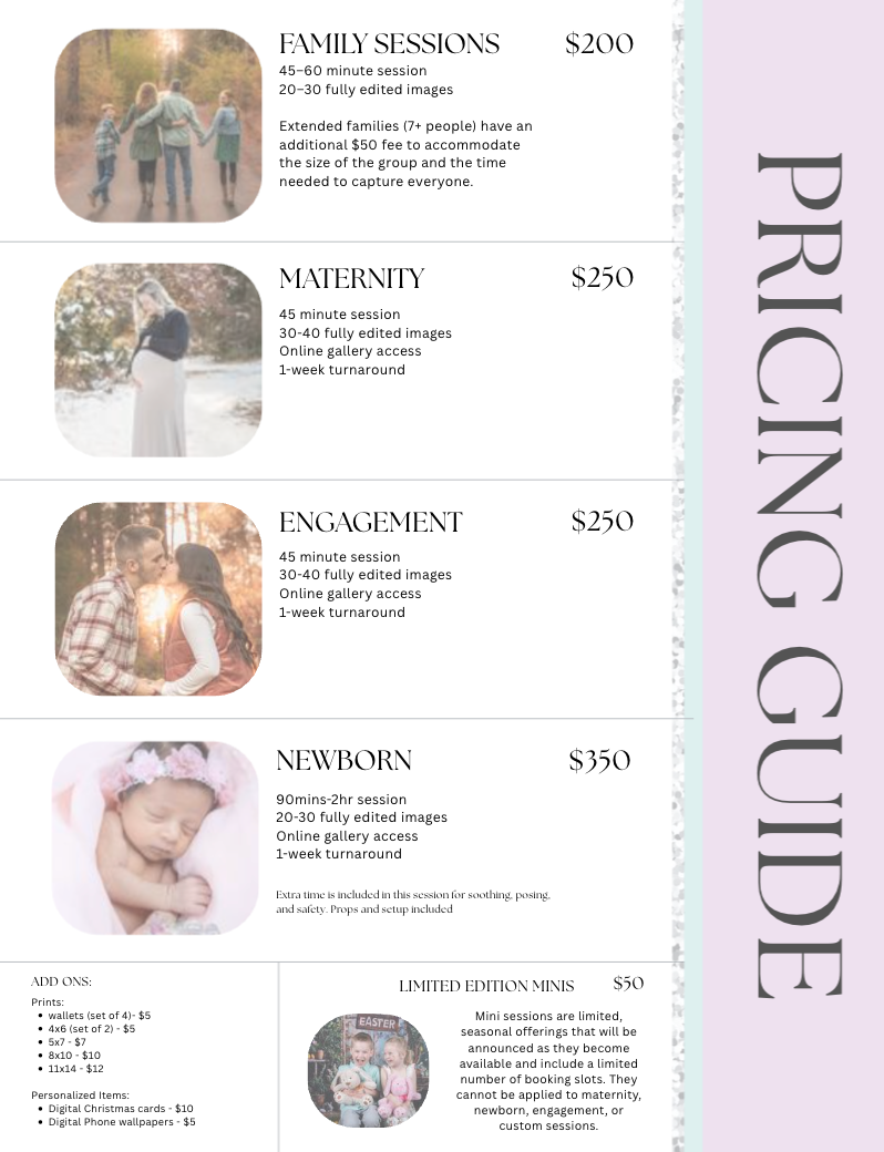 Below is my current pricing information. If you don’t see a package that fits what you’re looking for, just reach out and we can create something perfect for you!